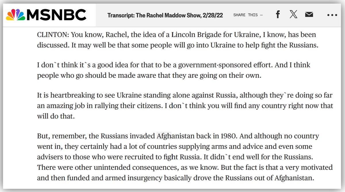 a) Først frarådet Clinton at amerikanske myndigheter skulle sende frivillige til å delta i krigen i Ukraina. 🧵1/11