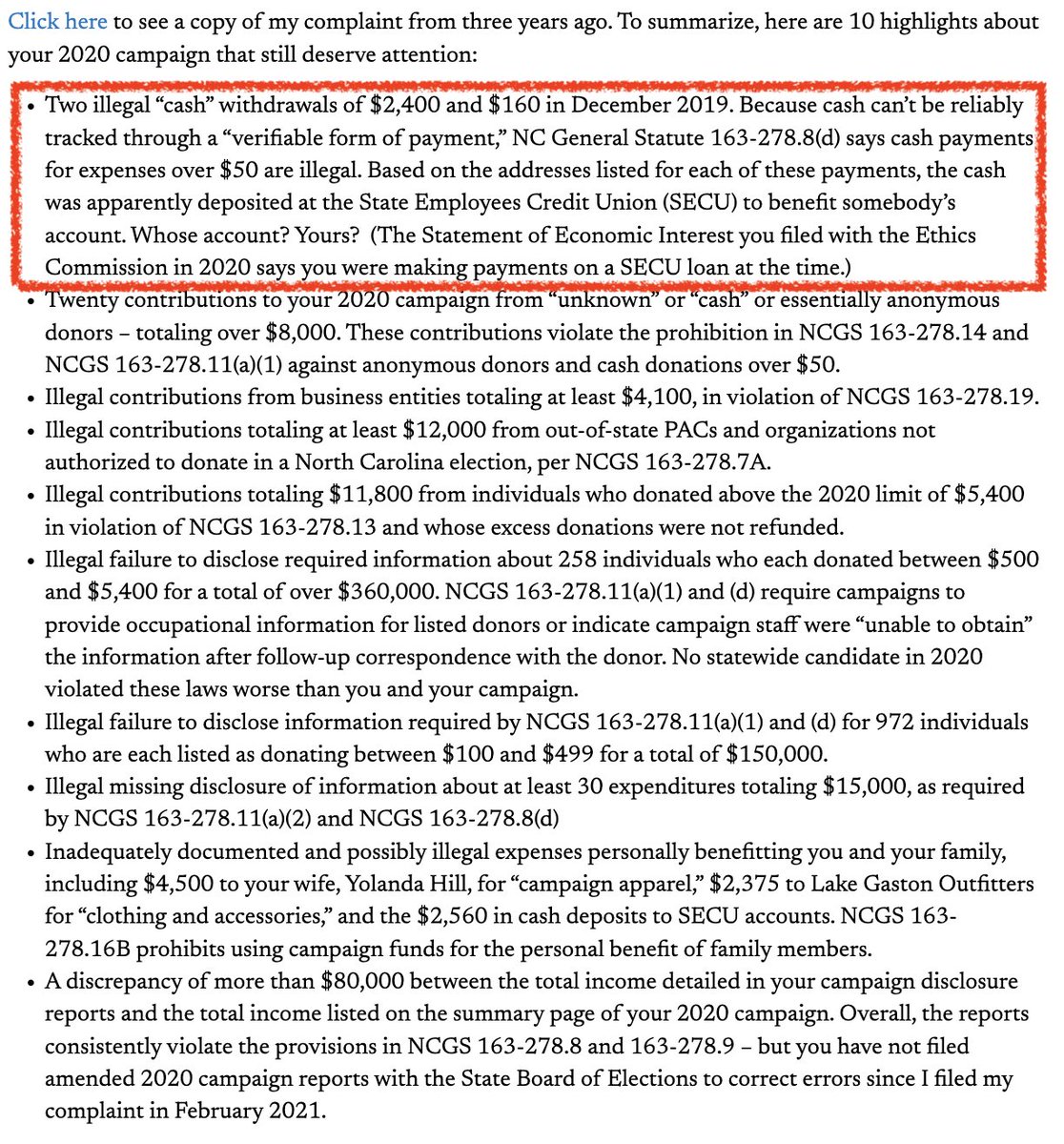 Robinson claims he spent thousands in campaign funds at a store who has no record that it happened, and around the same time he deposited thousands at a credit union where he held a personal loan. #ncpol 🧵
