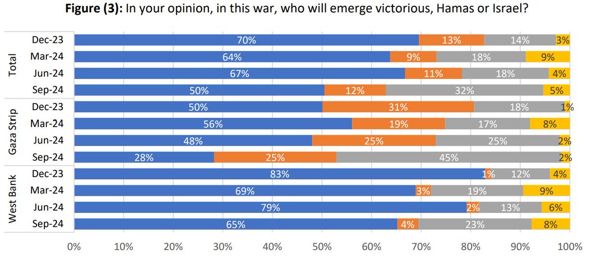 A record low share of Gazans, only 28%, believe now that Hamas will win the war (down from 56% in March and 48 in June). Almost the same share, 25%, believe that Israel will win the war. West Bankers are still optimistic (65%), though not as much as in the past. /4
