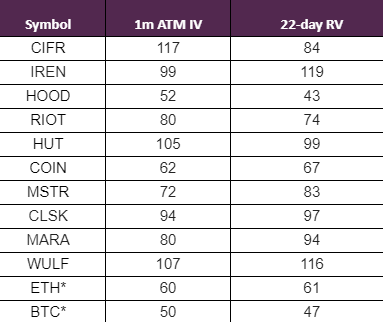 27/ lastly, elevated / expensive vols on single-name proxies for crypto exposure (MSTR, COIN, miners etc, which can be 70-100 vol) may compress and be more contained relative to BTC vols (typically in the 40-50 vol range now) as dealers are more willing to run short single-name vs underlying commodity vol spreads