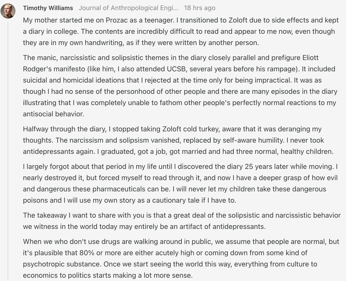 In this article, I present the decades of evidence showing a strong link because SSRIs and suicide, homicide or mass shootings. This includes unpublished industry trials (including in animals) showing hostility, and review many tragic SSRI shootings. midwesterndoctor.com/p/the-evidence…