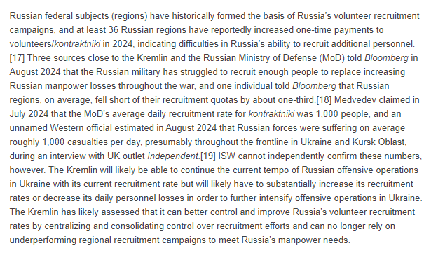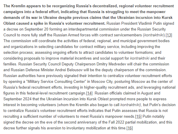 3/ The Kremlin has likely assessed that it can better control and improve Russia's volunteer recruitment rates by centralizing and consolidating control over recruitment efforts and can no longer rely on underperforming regional recruitment campaigns to meet Russia's manpower needs.