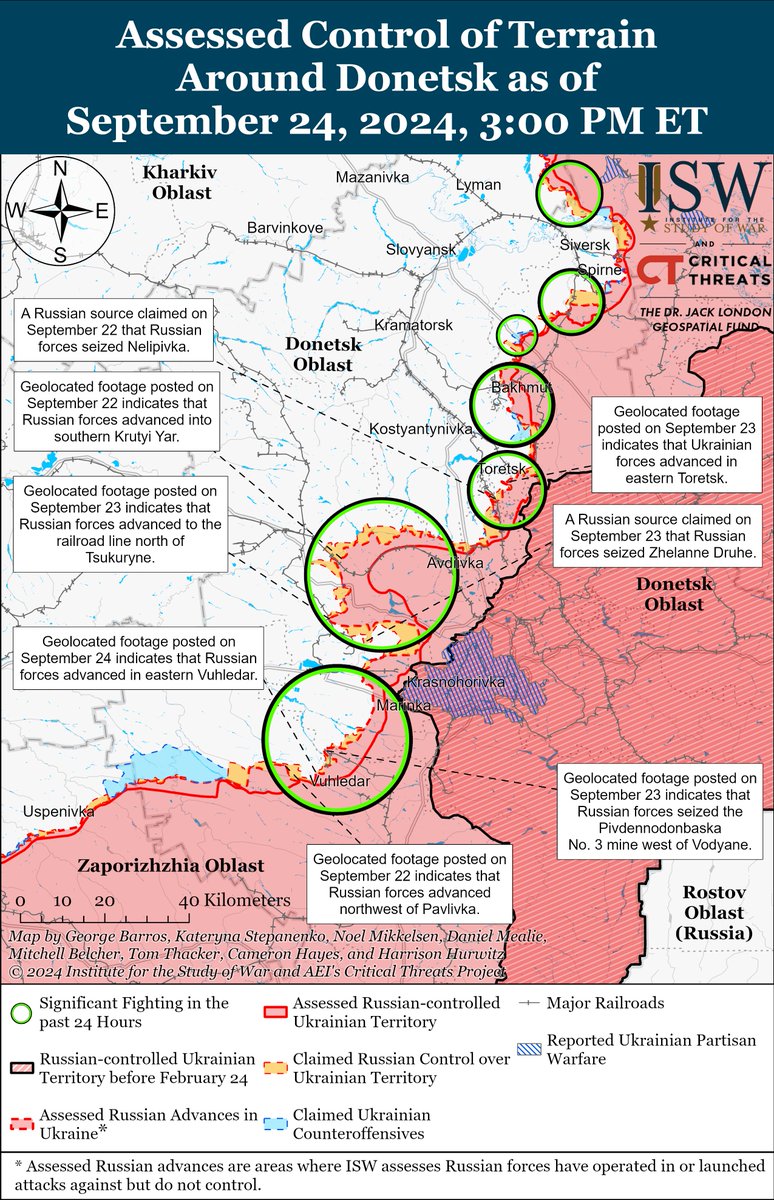 6/ Russian forces advanced east of Pokrovsk amid continued offensive operations on September 23. Geolocated footage published on September 23 indicates that Russian forces recently advanced north of Tsukuryne and east of Mykolaivka (both southeast of Pokrovsk).