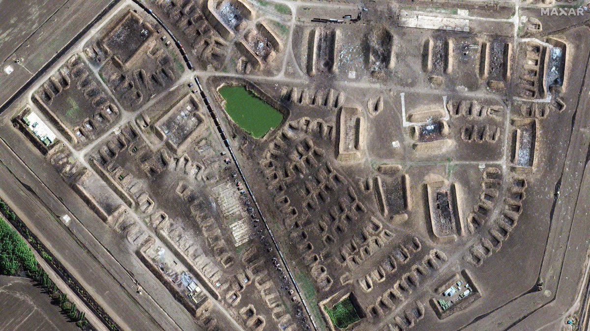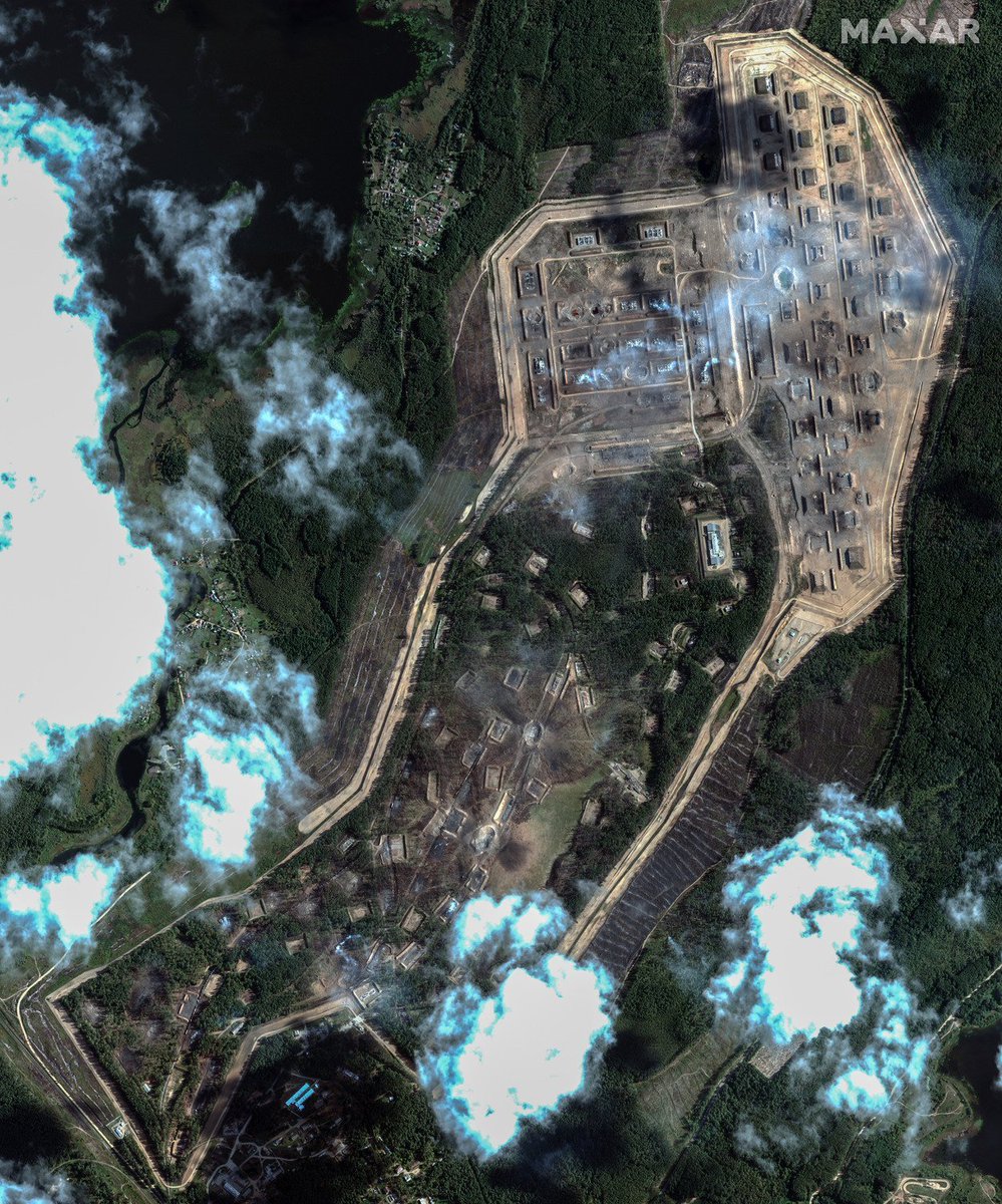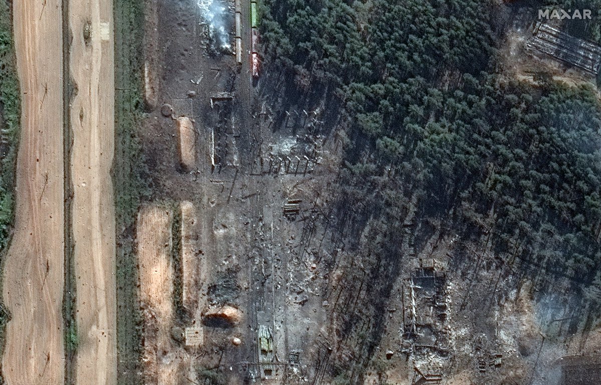 3/ The imagery depicts the destruction of dozens of ammunition storage buildings, rail cars that Russian forces likely used to transport ammunition to the depots, & masses of probable rocket canisters & other material that RU forces had haphazardly left in the open. 📸: @Maxar