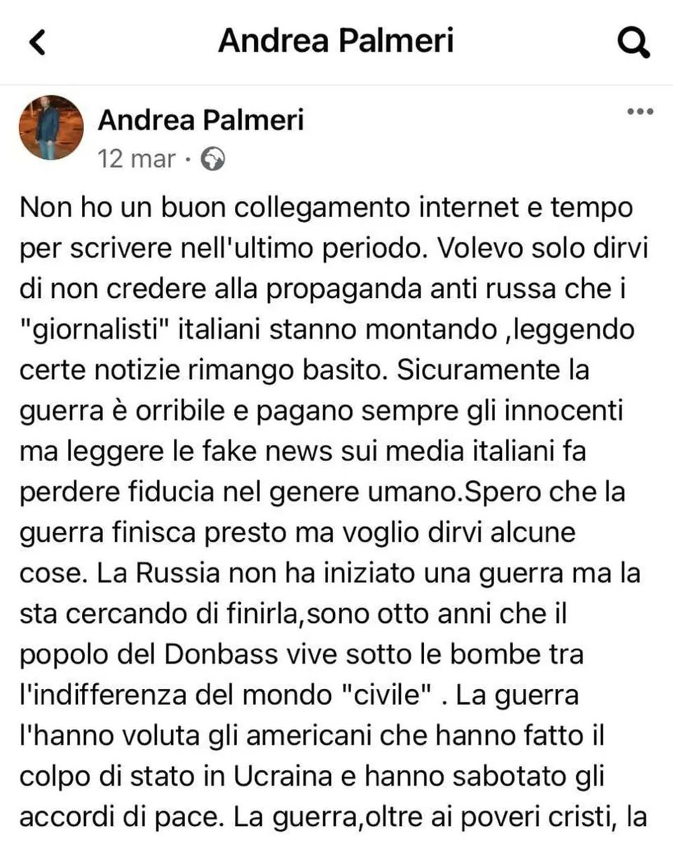 12/Quasi ogni giorno sulla sua pagina tiene un particolare diario di guerra: «Volevo solo dirvi di non credere alla propaganda anti russa ➡️ che i "giornalisti" italiani stanno montando ⬅️…