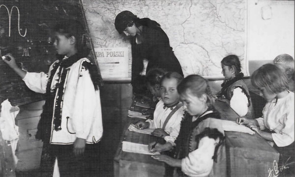 Dzieci w strojach regionalnych uczą się w szkole