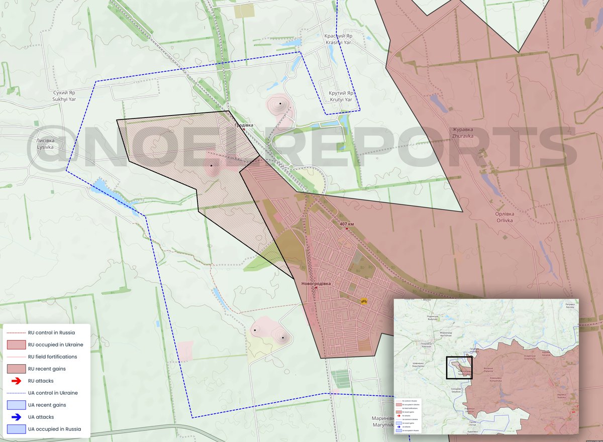 Russians have advanced towards Lysivka, based on geolocated footage. Only ~9km remains until Russians have reached the outskirts of Pokrovsk itself.