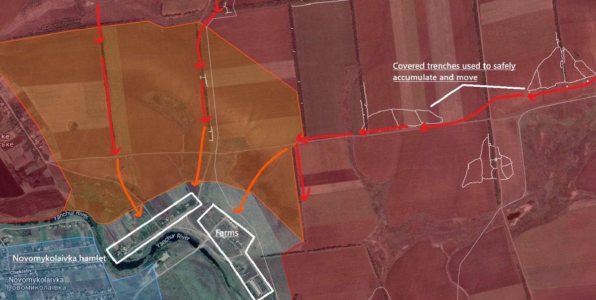 Until now, the Russians advanced well to Uspenivka, effectively exploiting the very well-built Ukrainian trenches (that were simply abandoned by Ukraine) to accumulate their own manpower and transfer it without Ukrainian FPV threat. Once they reached the Yanchur river, it was imperative for them to force it immediately to exploit an almost complete lack of any Ukrainian organized defense effort, but to do this it was essential to secure the farm at 47.770945, 36.454224 (east of Novomykolaivka), and the small part of Novomykolaivka located east of the Yanchur river (1 single line of houses) at 47.771161, 36.447422.
