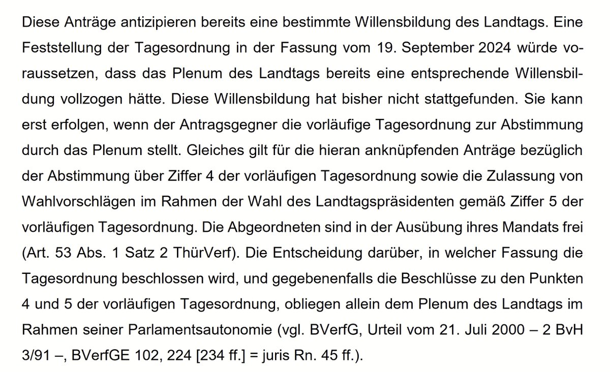 Sehr umfassend aber sorgfältig wird erläutert, warum das Parlament selbst entscheiden darf, wann es worüber entscheiden will, somit also eine keine Reihenfolge oder frühere GO gebunden ist. Damit war der Antrag von CDU und BSW zulässig.