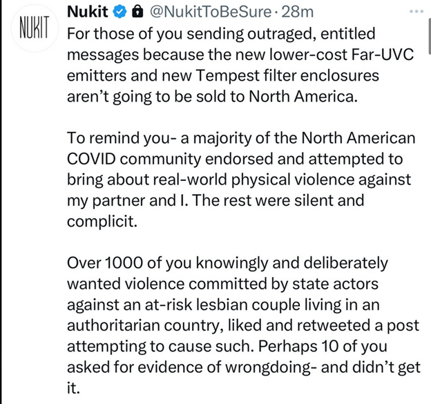 Nukit sells highly effective UV lamps that reduce infectious aerosols, lowering the risk of viral transmission. People like me, suffering from long Covid, rely on these lamps to occasionally go out safely, especially when eating at restaurants where wearing a mask isn't possible.