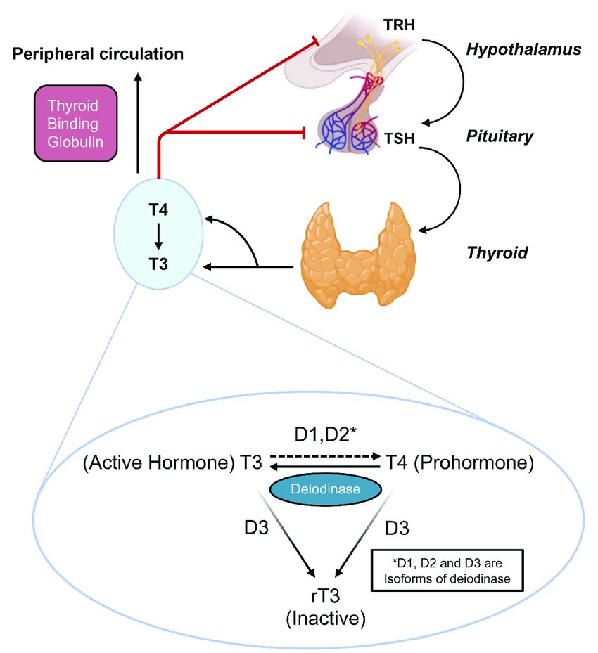 The thyroid then produces T4, which converts to the active form T3.