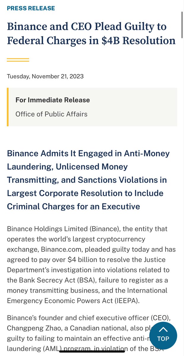 In November 2023, Binance and its found plead guilty to money laundering, sanctions violations and other offenses.