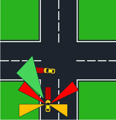 As seen below, before we make a turn, we should scan the area ( green triangle ). If the intersection is having visibility issues, stop, look and proceed.