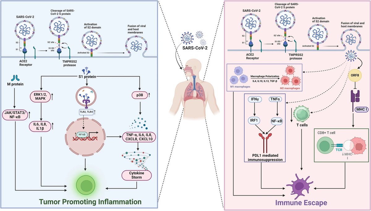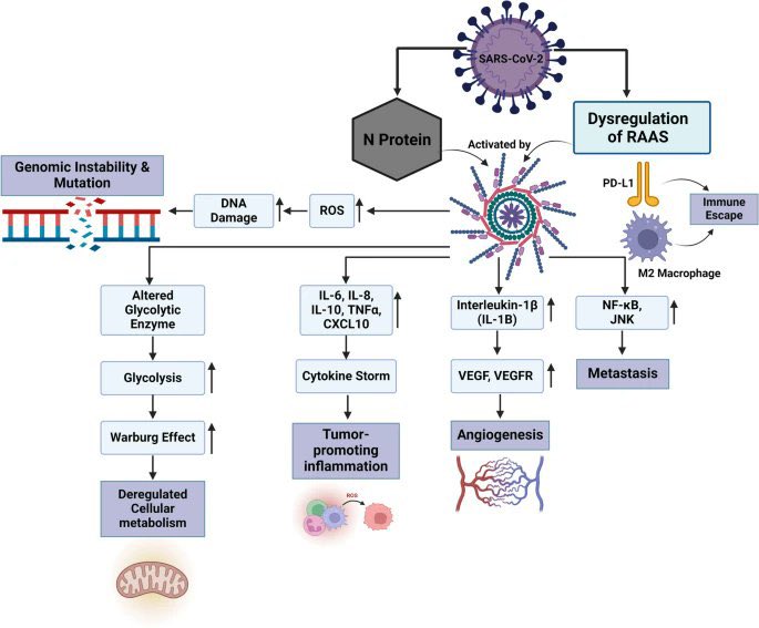 Jüngste Studien haben verschiedene Mechanismen aufgedeckt, durch die SARS-CoV-2 onkogene Signalwege beeinflussen und damit möglicherweise die Krebsentwicklung fördern kann. Das Virus kodiert für mehrere Proteine, die wichtige Signalwege verändern, die mit Krebsmerkmalen in