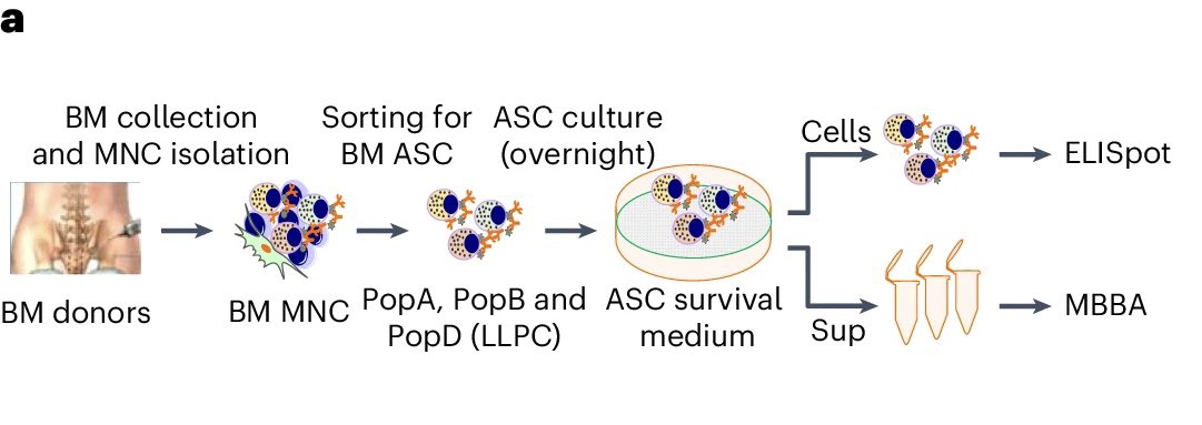 Um dieses Paradoxon zu erforschen, wurden 19 gesunde Erwachsene 2,5 bis 33 Monate nach Erhalt eines SARS-CoV-2-mRNA-Impfstoffs untersucht und Influenza-, Tetanus- oder SARS-CoV-2-spezifische Antikörper-sezernierende Zellen (ASCs) in langlebigen Plasmazellen (LLPC) und