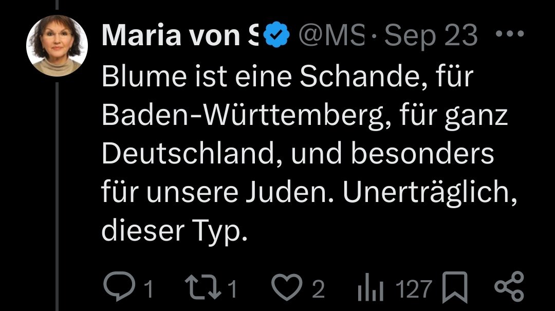 @MSchlippenbach: "Blume ist eine Schande, für Baden-Württemberg, für ganz Deutschland, und besonders für unsere Juden. Unerträglich, dieser Typ."