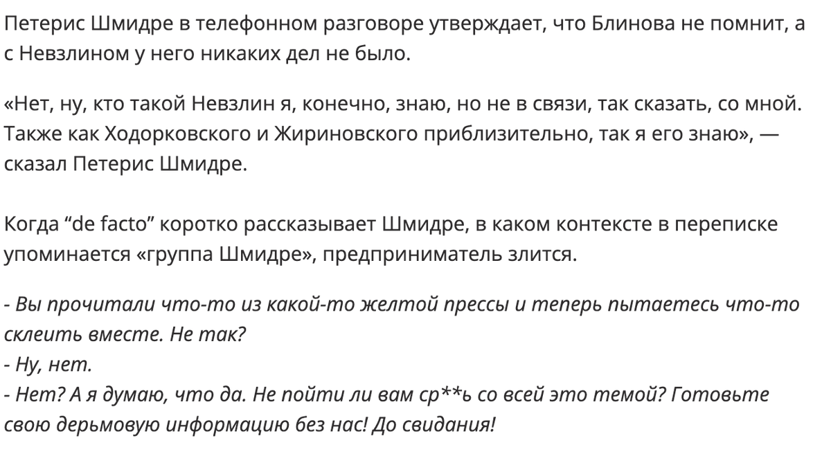 Среди них Гусинский, Дерипаска, и в первую очередь, Петр Авен. Невзлин заказывал, а Блинов размещал материалы через желтые СМИ, которые входят в группу компаний Петериса Шмидре. Все эти материалы без труда можно найти, как и обсуждение денег, которые были за них заплачены.