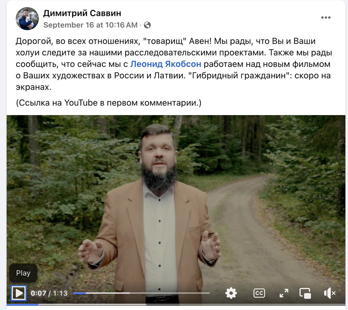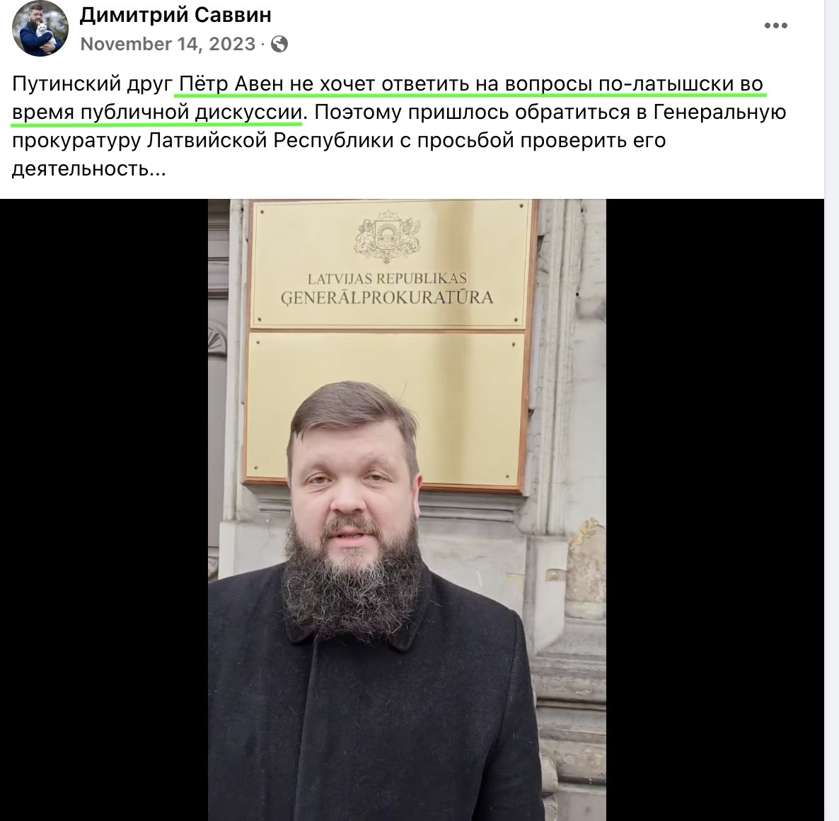 Далее там еще более смешной и однозначный эпизод. Есть в Латвии такой "активист" Дмитрий Саввин. Он притворяется независимым возмущенным латышом, который самостоятельно расследует дела олигарха Авена в Латвии и смело проливает свет на правду.