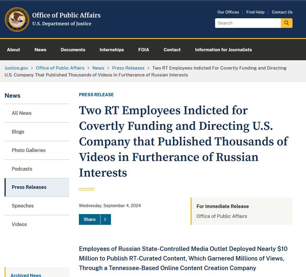 Sept 2024 publizierte das US-Justizministerium eine Anklageschrift, in der 2 RT-Mitarbeiter angeklagt wurden, da sie 10 Mil EUR an TENET Media in Tennessee gezahlt hatten, um in den US-Medien pro-Kreml Standpunkte zu fördern. TENET Media schloss lukrative Verträge mit…