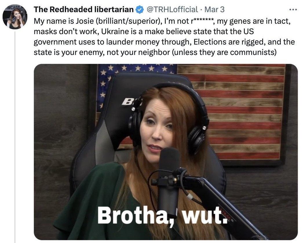 Tims Co-Moderatorin Josie Glabach alias „The Redheaded Libertarian“ ist auch auf den pro-Kreml/Kremlintarier-Zug aufgesprungen & wird eine der Rednerinnen bei einer weiteren „Antikriegs“-Veranstaltung derLibertären Partei sein:
