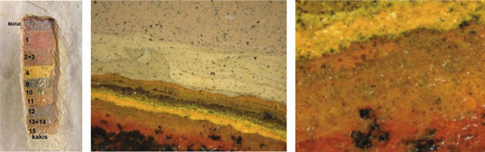 3mm de peinture, 19 couches, certaines au plomb. Pas possible de les retirer par voie chimique, peut être par induction. Manuellement c’est fastidieux, mécaniquement cela génère beaucoup de poussières. Ci-dessous une coupe des différentes couches (rapport C. Dandrel,2018)