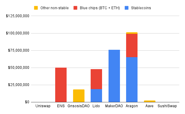 we can see that Uniswap, Aave, ENS and Sushiswap have over than 94% of their total treasury in their own tokens