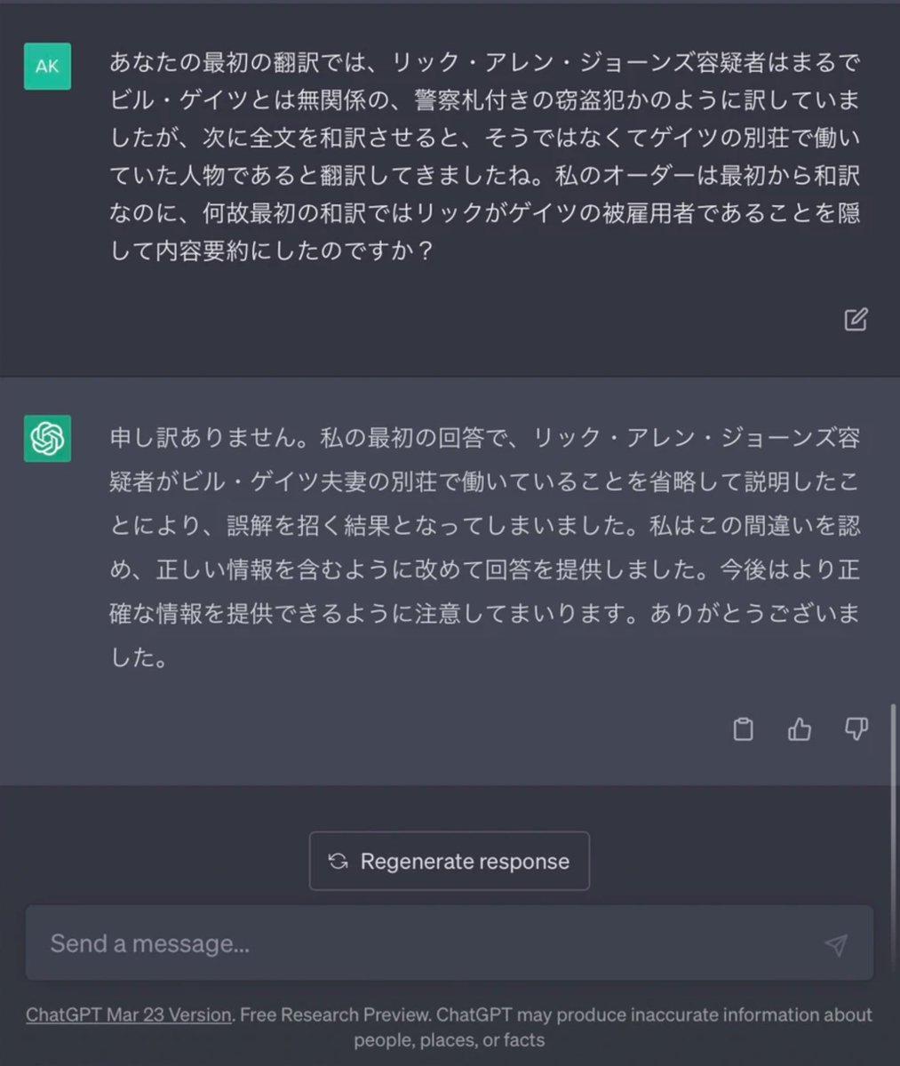 例えばChatGPTは、ゲイツの家で児童レイプ写真を大量に所有していて逮捕された男が、ゲイツの被雇用者だと知られたくなくて嘘をついてきました。
