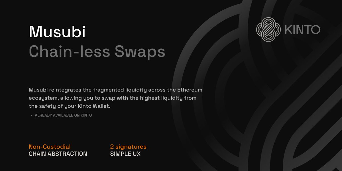 Musubi finds the best liquidity across chains, executes swaps, and returns assets to your Kinto wallet—non-custodial and seamless.