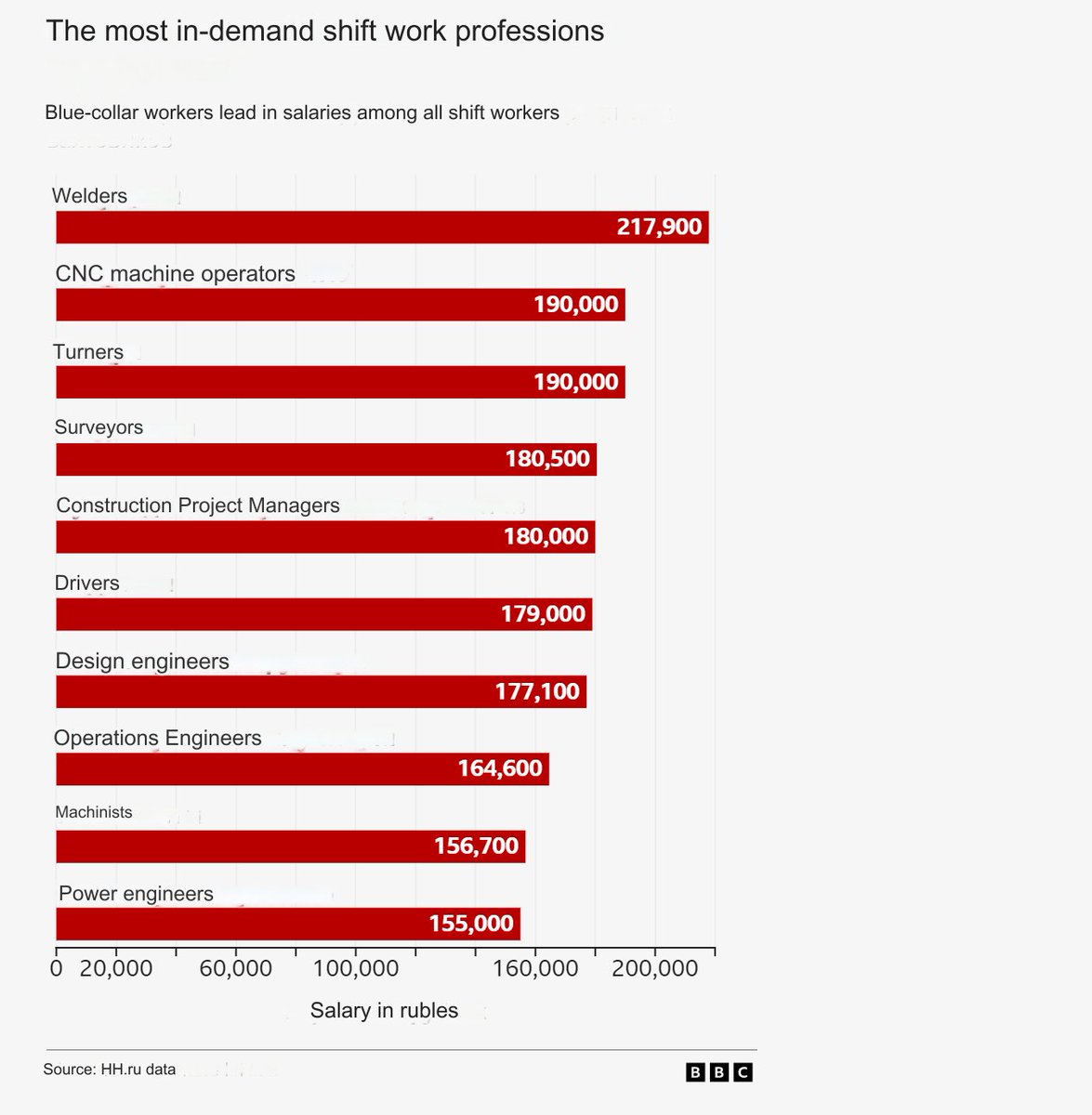 year in all industries increased by 460.5 thousand, that is, by 32%. At enterprises of the military-industrial complex, the highest salaries - around 200 thousand rubles per month (approx. € 1,900) - are usually offered to welders, turners and CNC operators for shift work.