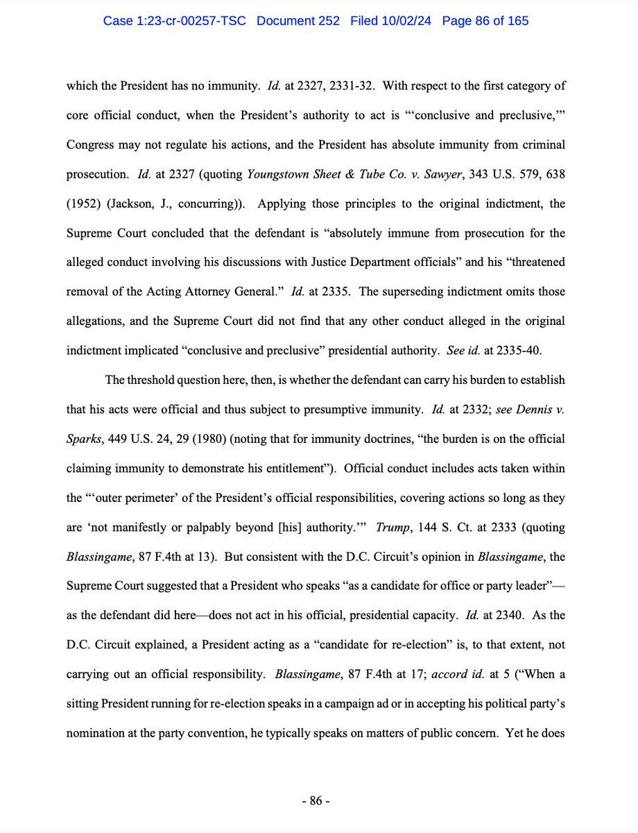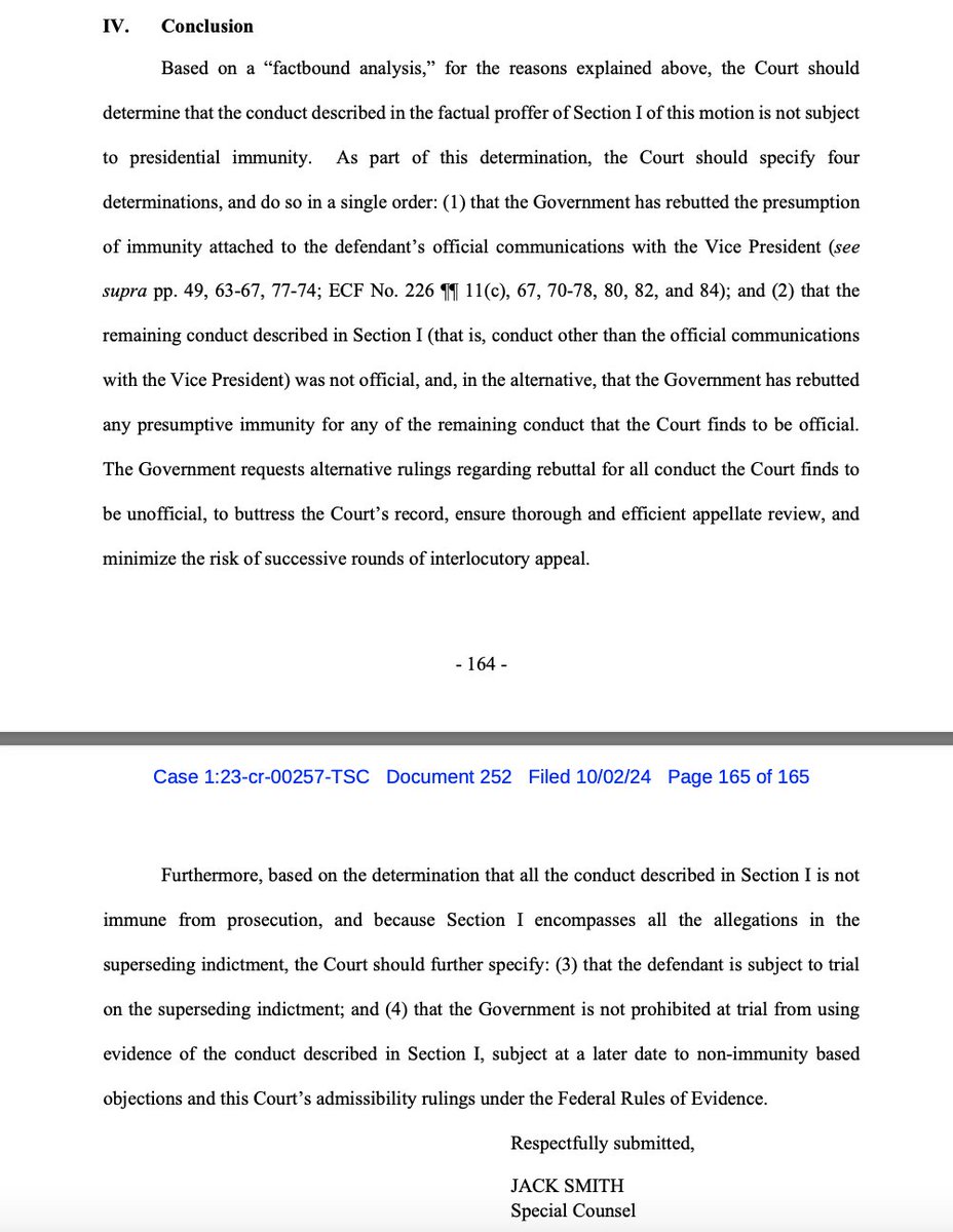 Jack Smith's full conclusion: all of these facts can be proven in a court of law with evidence and Donald Trump is not entitled to Immunity and should proceed to trial. Also, Smith asks that everything submitted in Section 1 be allowed at trial. 17/