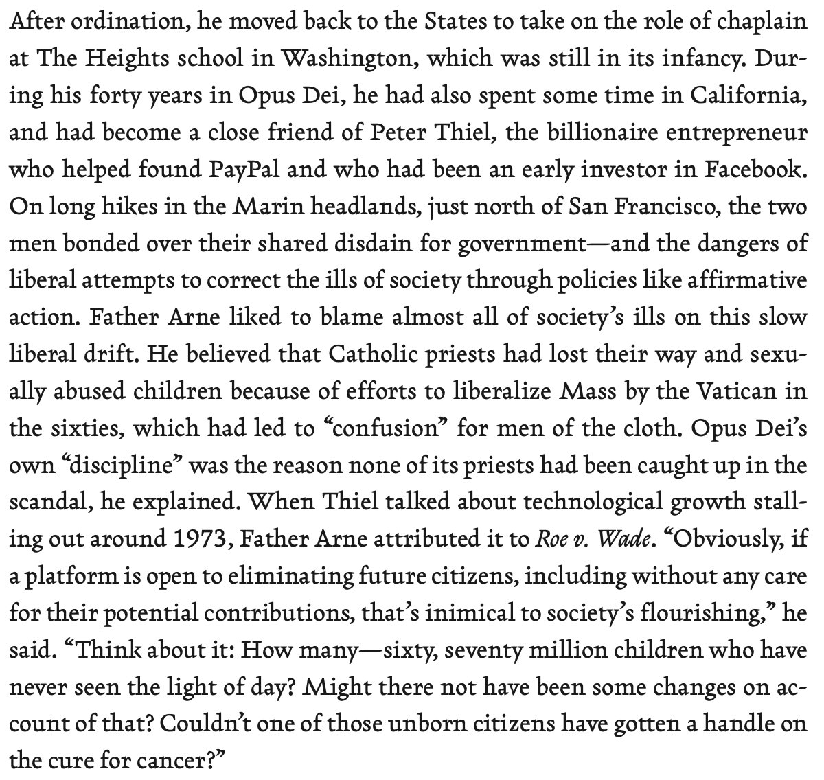 Thiel was close to Opus Dei priest Arne Panula. The two men bonded over their shared disdain for government.