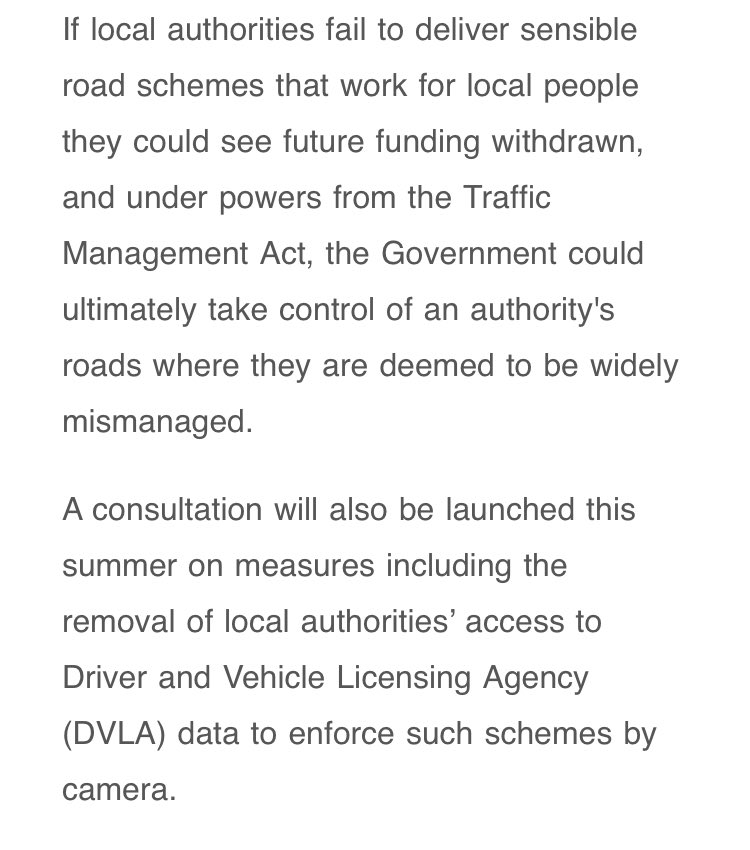 But it is worth noting that the only new sticks the DfT offer to stop councils building new LTNs - taking control of roads and/or removing DVLA access - are legally very complex and thus highly unlikely to happen. 3/