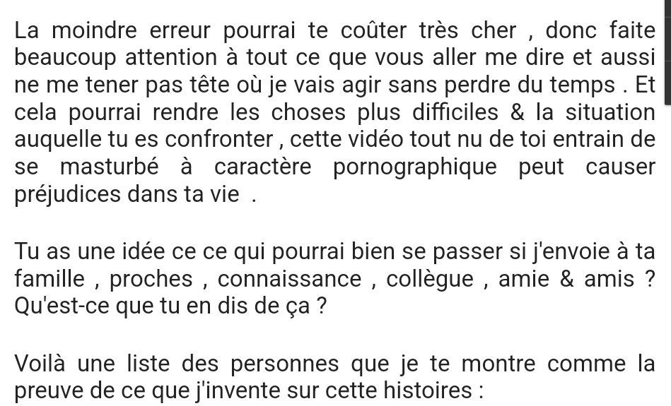 Il va peut être prétendre vouloir vous pourrir votre vie.Souvent, ces mots il ne les a pas écrit. Les auteurs de sextorsion, comme dans les autres arnaques de brouteurs, utilisent parfois des textes pré écrits : "des formates".