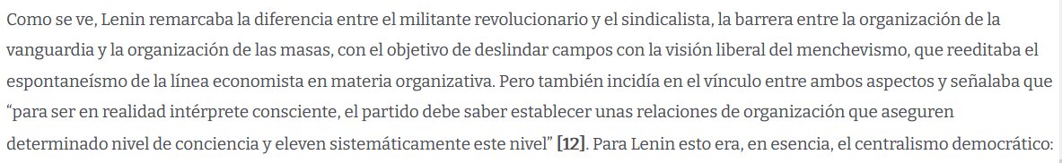 Mientras tanto, la fórmula leninista y su posterior conceptualización condensa la diferencia cardinal entre la conciencia revolucionaria y la conciencia espontánea, entre la vanguardia y las masas, entre el revolucionario profesional y el cuadro sindical.