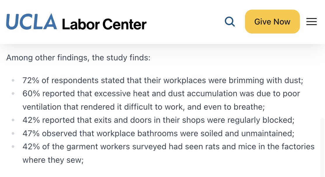 This system is incredibly common. A 2016 UCLA Labor Center study showed the median piece-rate worker in Los Angeles scrapes together $5.15 per hour—less than half the state’s mandated minimum wage. Labor conditions are also very bad: poor ventilation, dusty air, rats and mice.