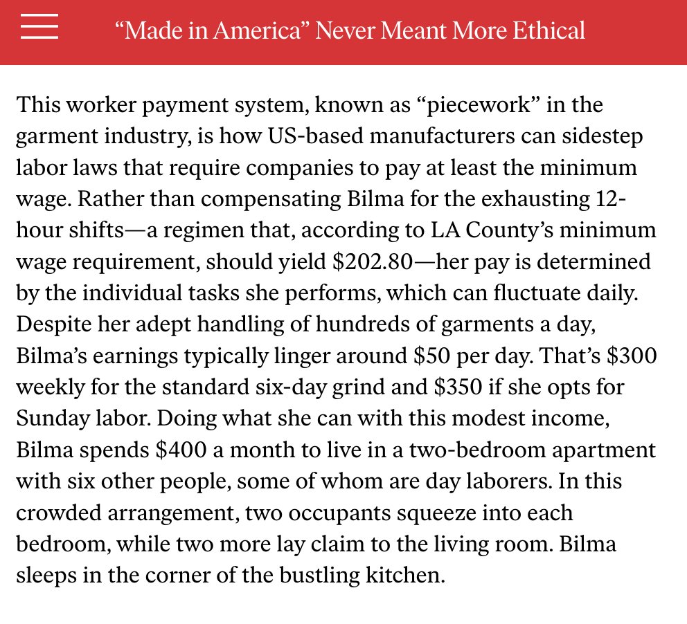 In 2021, labor organizers won a fight to get piecework banned in California. But two years later, it's still incredibly common. I interviewed an LA-based garment worker who toils 12 hrs a day for $50. She sleeps in the corner of a kitchen. From my article in The Nation: