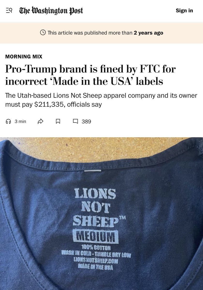 But it's incredibly common for companies to violate FTC rules. In 2022, the FTC fined the pro-Trump brand Lions Not Sheep $211k for labeling their t-shirts "made in USA" when the shirts were actually imported from China and other countries.