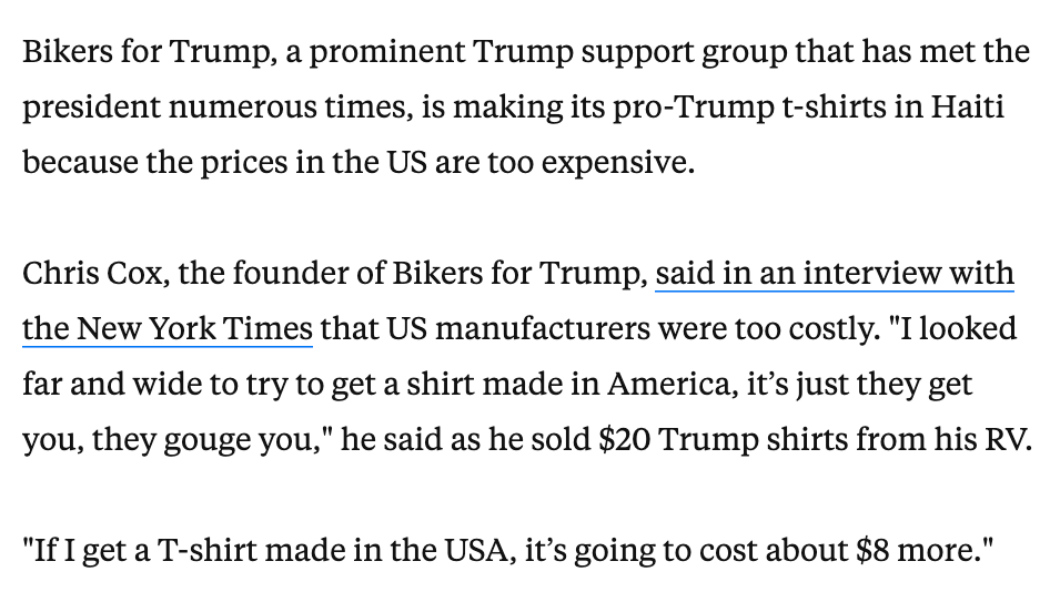 Once you add things such as screenprinting—or if you want a more unique cut and not just basic blanks—the costs go up. This is why Bikers for Trump sourced their merch from Haiti. They knew their customers would not pay an extra $8 for true made-in-USA production.