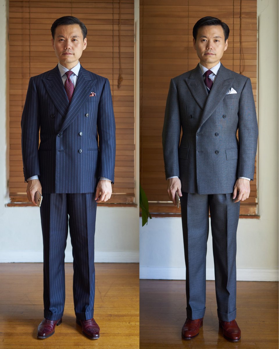 The shoulder line here is very padded. The lapel is wide. And the trousers are full.