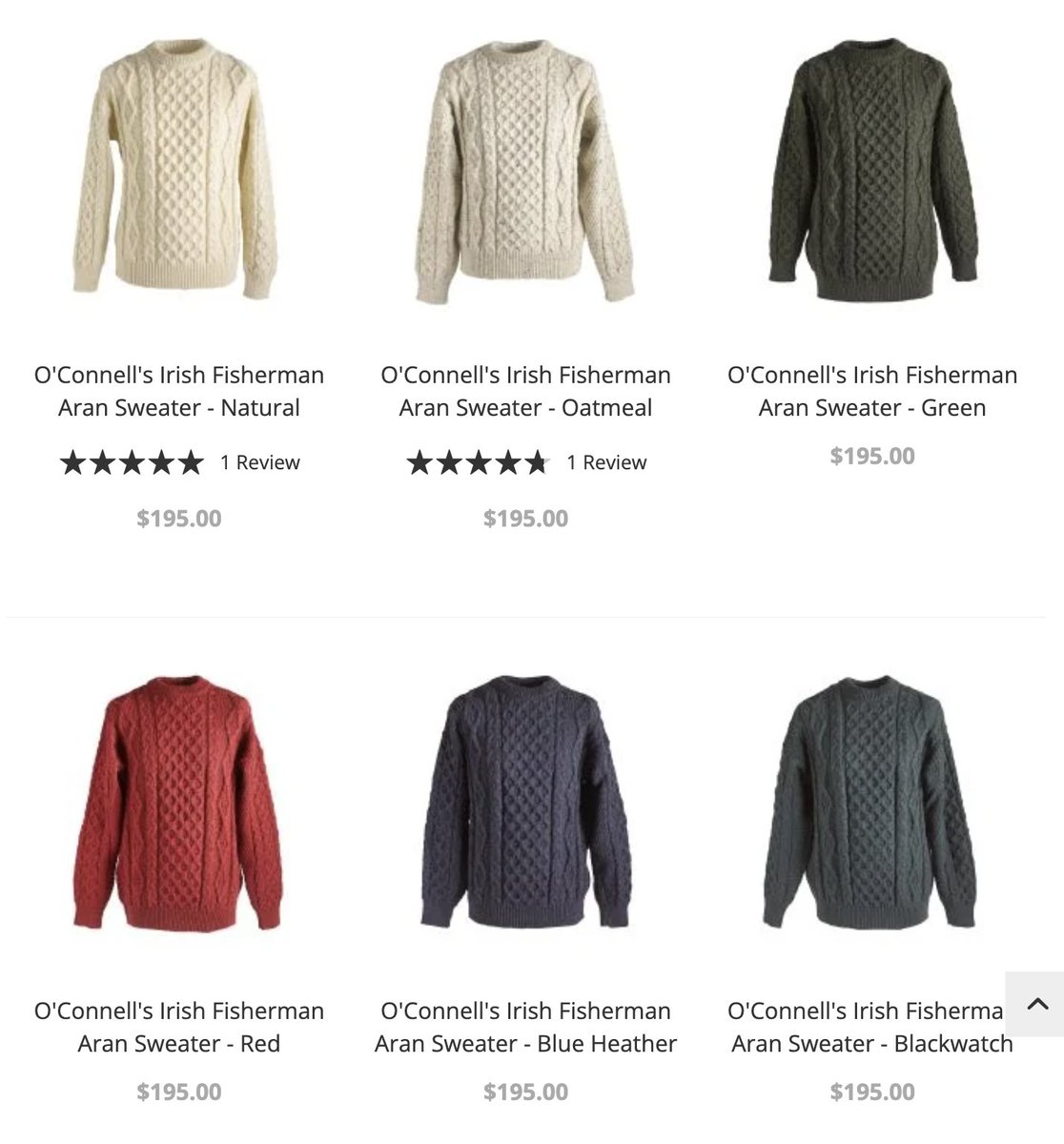 O'Connell's is a super trady shop in Buffalo, New York. They sell sack suits, madras shirts, Shetland knits, and the type of stuff you associate with 1950s Brooks Brotehers. They have Aran knits, including new old stock from the 80s and 90s (give em a call).