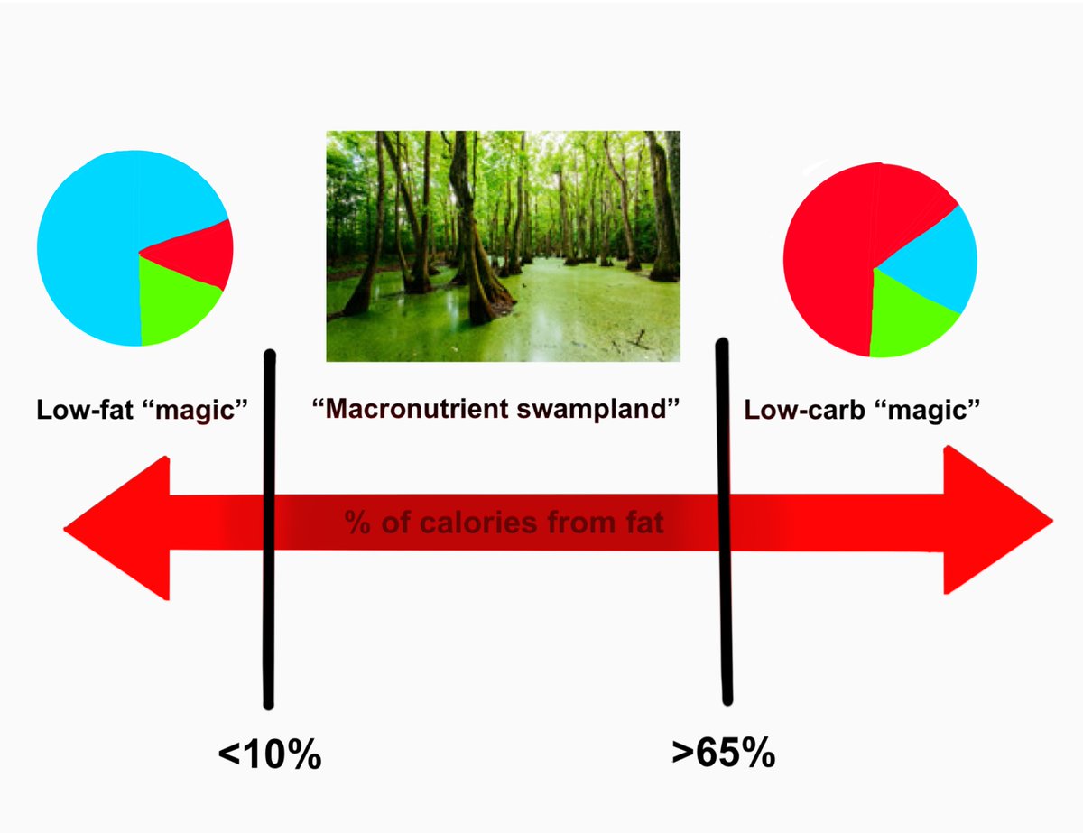 Denise Minger's (@deniseminger) "macronutrient swampland" is a simple concept which grows out of the Randle cycle: if one makes either carbs or fat a dominant macronutrient (minimizing the other), the body becomes adept at using whichever fuel source is prioritized.[62][63]