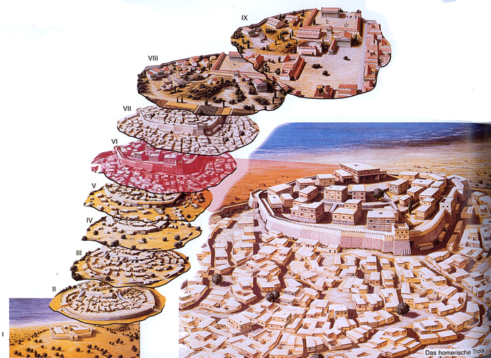 The site is divided into nine archaeological layers, being Troy VI (1750-1300 BC) and particularly Troy VIIa (1300-1180 BC) the ones that better fit into Homer's narrative.