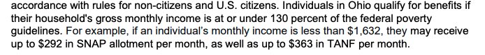 /14 A single Haitian alien in Ohio making less than $1,632/monthly is eligible to receive $292 in SNAP benefits and $363 in cash benefits.