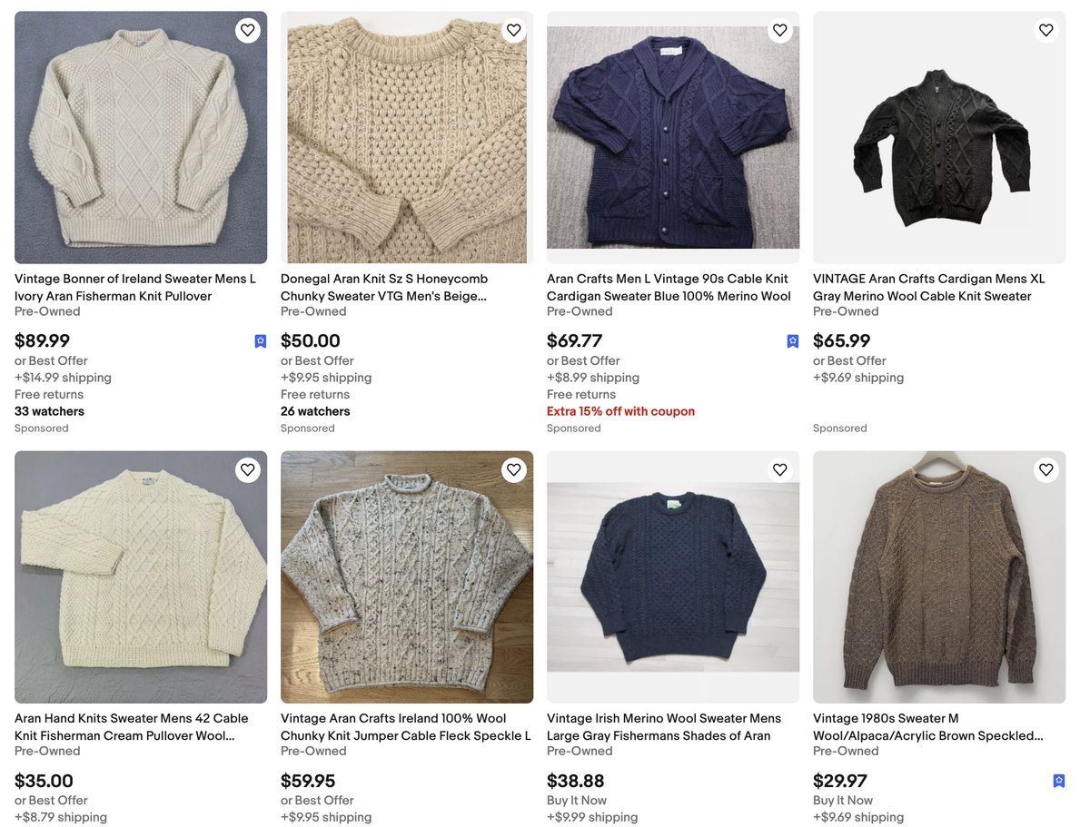 Of course, you can also go to eBay or Etsy, where there are thousands of vintage Aran knits for like $50 to $75. I would try to find something made from pure wool and carries a "made in Ireland" label, just because I think it makes the knit more interesting.