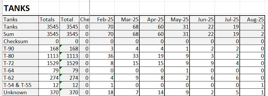 8) Here is the data table I created based on the loss data by @WarSpotting and when I have referred to storage numbers it's based on satellite counts of IFV/APCs led by