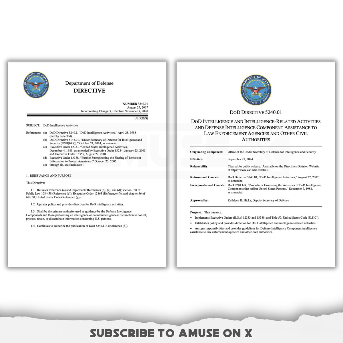ASSASSIN@TION: If you'd like to compare the 2007 and 2024 DoD Directive 5240.01 yourself, here are the PDFs. You can upload them into ChatGPT and ask the LLM to compare and contrast the two versions. The 2024 version is 244 pages compared to 43 in 2007 version. Be sure to ask the LLM to explain how the 2024 update removed the original 2007 directive included a clear and unambiguous statement that "Under no circumstances shall any DoD Component or DoD employee engage in, or conspire to engage in, assassin@tion."
