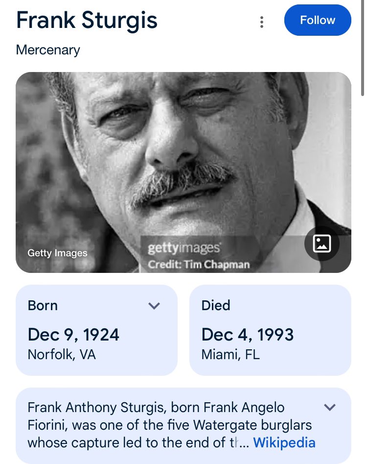 Frank Sturgis is a well known mercenary, who you may know as someone who was part of the watergate scandal (yeah they were involved in that to) and has been implicated in the JFK conspiracy by multiple witnesses. Further, most say he has ties to the CIA, but if you trace his history, it’s more pronounced that he has ties to the Mossad.