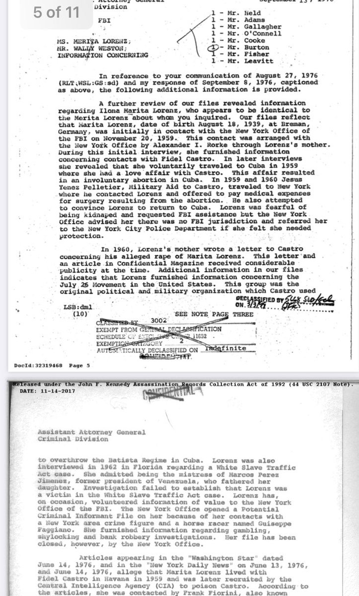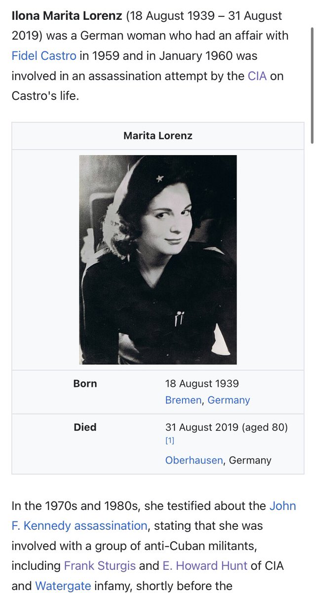 Marita Lorenz comes out of nowhere in 1970’s and claims she was working for with Frank Sturgis, Howard Hunt, and the CIA to infiltrate and take out Castro. She also drags in Oswald and said she met him in 63, and even claims she met Jack Ruby at one point.