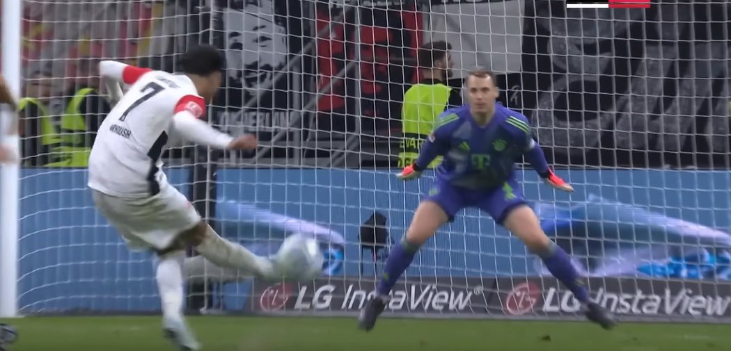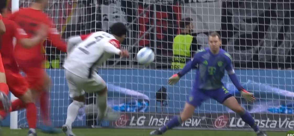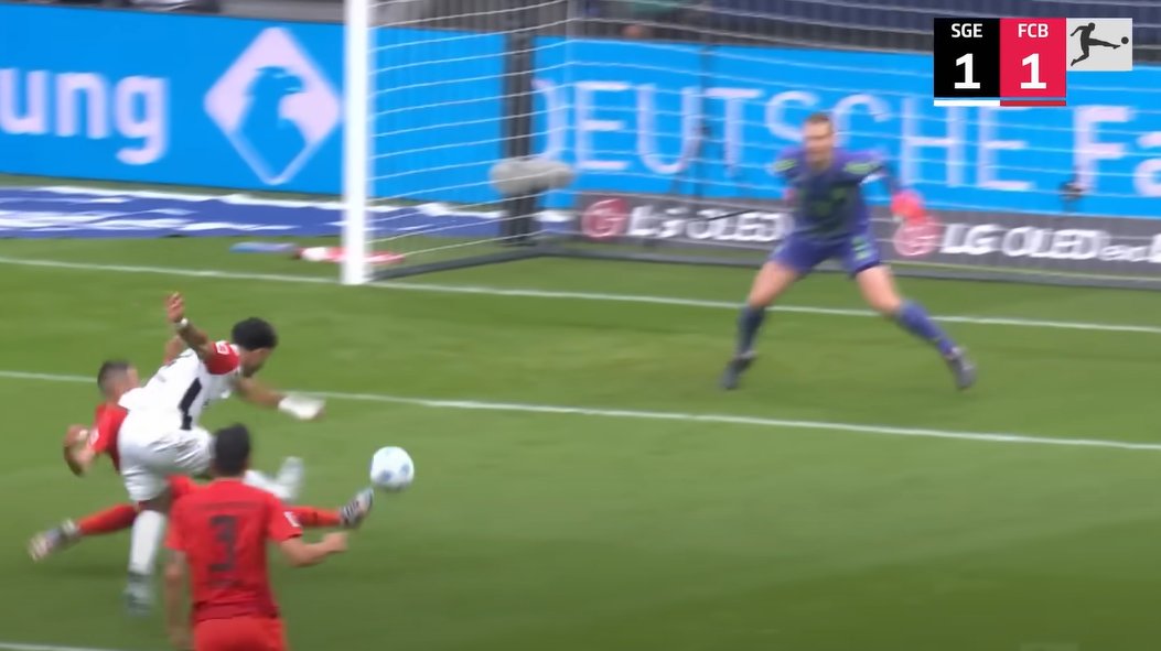 Ist trotzdem crazy, dass #Neuer überhaupt Anstalten macht diesen Ball abfangen zu wollen. #Duran ist klar vor ihm am Ball & Upamecano wäre bei einer Mitnahme auch dran. Da muss er sich absetzen, Tiefe schaffen & sich auf die Torverteidigung fokussieren.