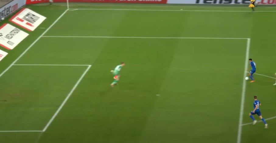 Vermutlich war es genau dieser unsaubere Kontakt von #Raphinha, der #Neuer dazu bewog, sich nicht noch weiter fallen zu lassen. Irgendwann muss er ja ins 1gg1 kommen. Bei dem Tempo des Stürmers hast du eigentlich kaum eine Chance.